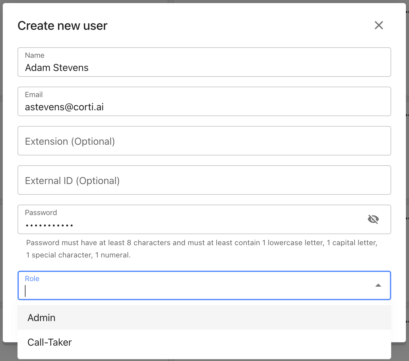 💡 The user's Role is set according to the type of user you want to create and their permissions (i.e. Admin, Call Taker, QA Manager, etc.).