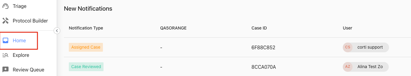 A user with access to Home can see notifications on assigned and reviewed cases there.
