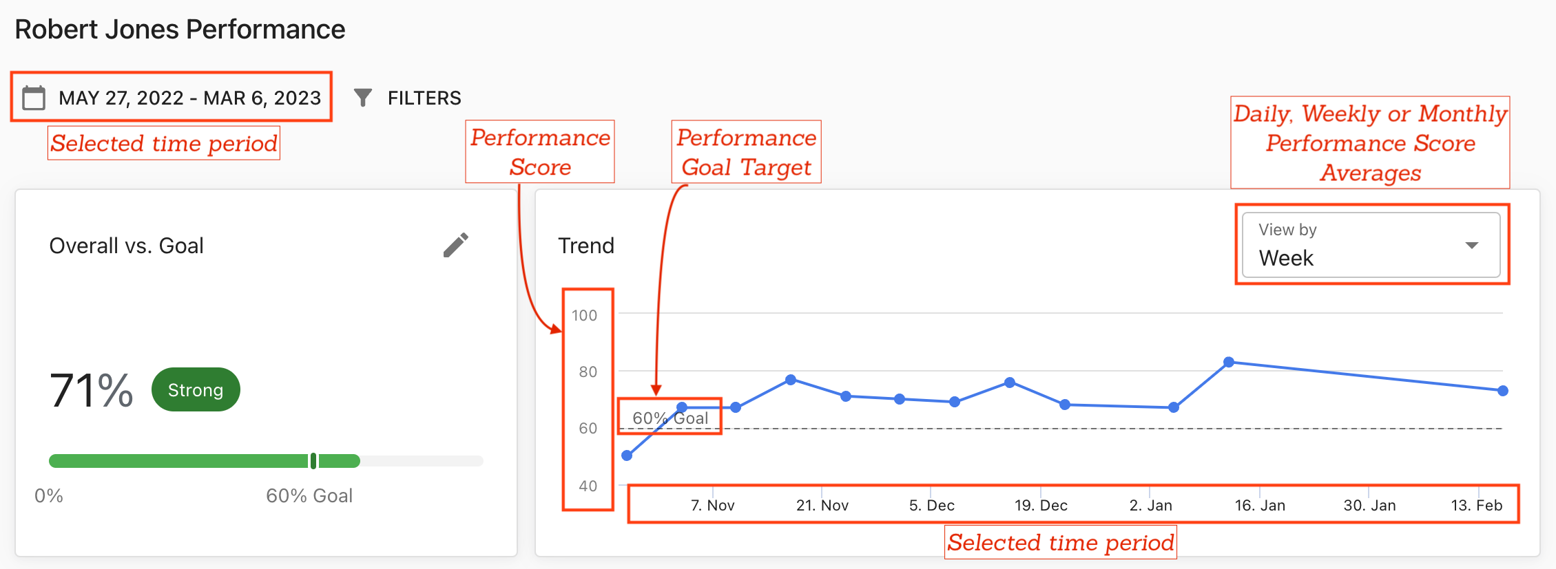 The Performance Graph can be accessed from the individual, team and organization performance dashboards. Permissions for Dashboard App and Team Performance App are required to view the Performance Graph.