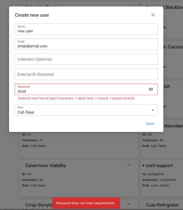 While adding a new user, if a password did not meet requirements Corti would return incomplete error message: Failed to save due to. New error message: Password does not meet requirements.